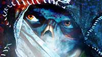 A complex multi-layered photo montage that combines numerous abstract images to create the base model before shadow and lighting was formed around the hood. The hand-drawn facial features offer semblance of a male face without skin, hair or other attributes. Multiple layered effects were then applied to numerous graphical elements to create and compose both the fire and ice opposites of the piece. Extensive lighting and colourisation was then created and applied to further underline the location and action of the scene.